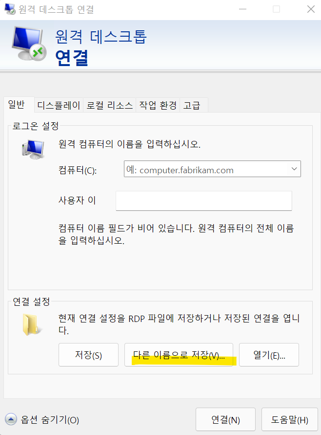 일단 원격 설정에서 옵션 표시 해주신 후 rdp 파일을 저장해야해요!